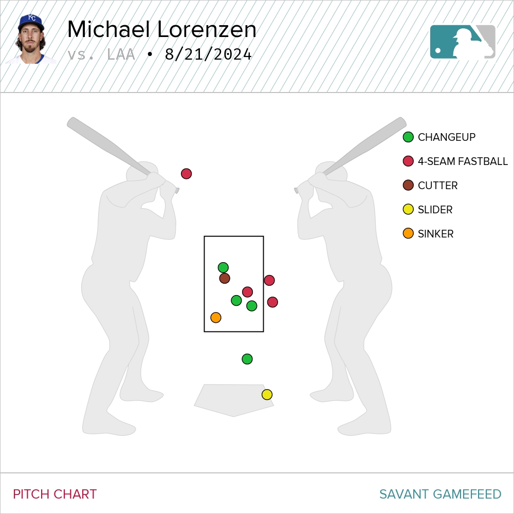 As Lance Brozdowski pointed out in his Substack, the Royals have unlocked the inner beast in Lorenzen. For starters, they’ve had him scrap the slider he was throwing to right-handed batters. Righties were hitting a robust .400 with a .686 slugging percentage on his slider. Yet he was throwing it almost 20 percent of the time. Since he’s joined the Royals, he’s thrown exactly one to a right-handed hitter—a spiked first-pitch to Jo Adell in the fourth inning on Wednesday.