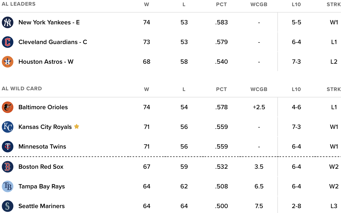 When I clip the Wild Card standings, I use .500 as my arbitrary cutoff. So I’ve noticed the Rays interjecting themselves back in the proceedings. Not sure what to make of that. The Mariners are in danger of their season slipping away after getting swept by the Dodgers.