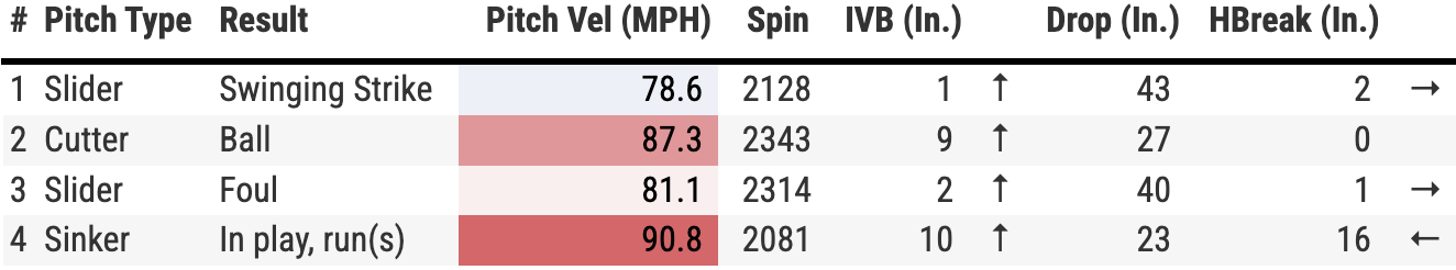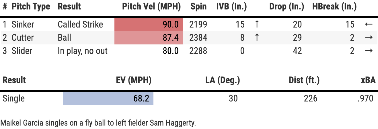 Recall in that second AB, Garcia whiffed on one slider out of the zone and fouled off the second. This time, he made contact. Not great contact as you can see above, but given that the result had an expected batting average of .970, it was the perfect little flare to the outfield.