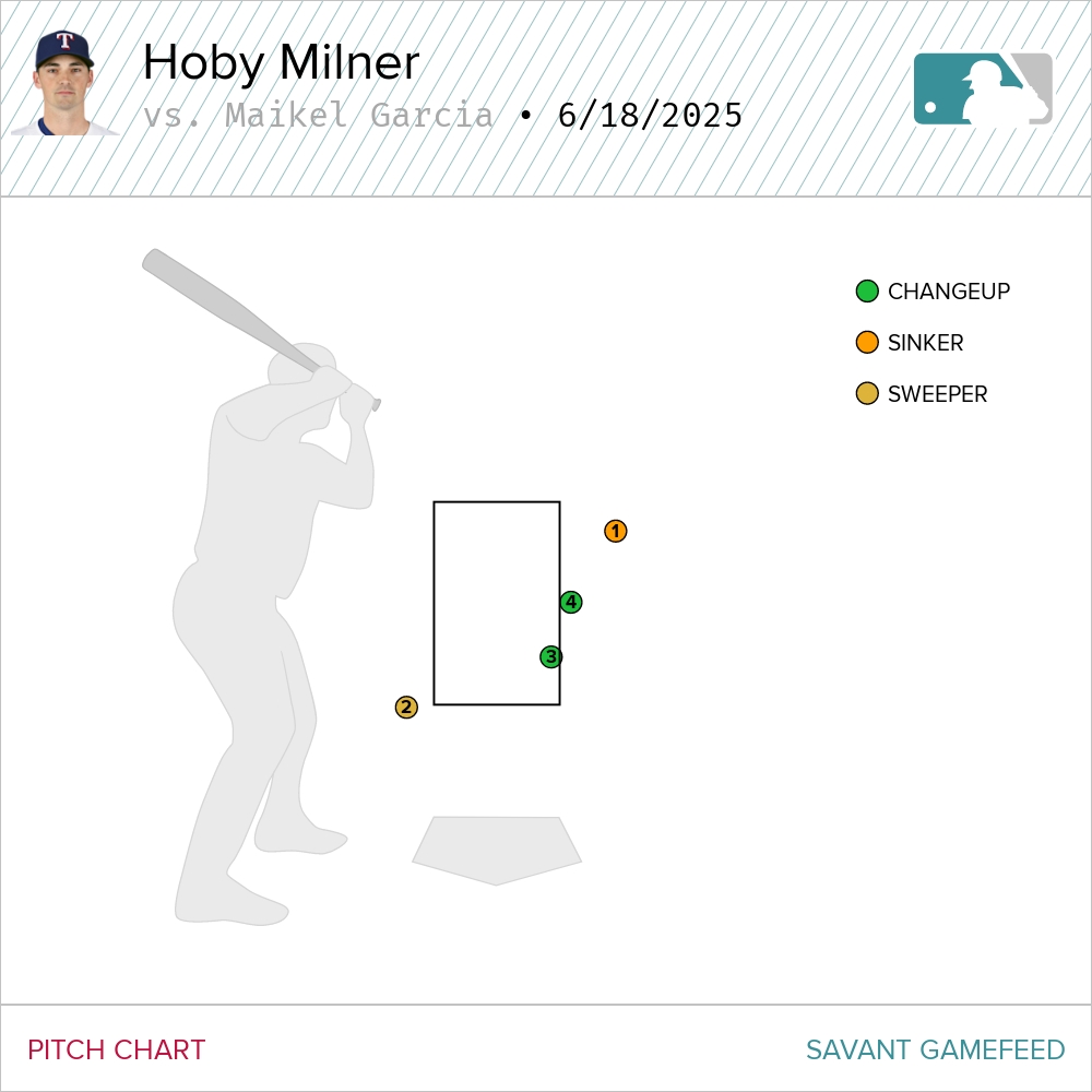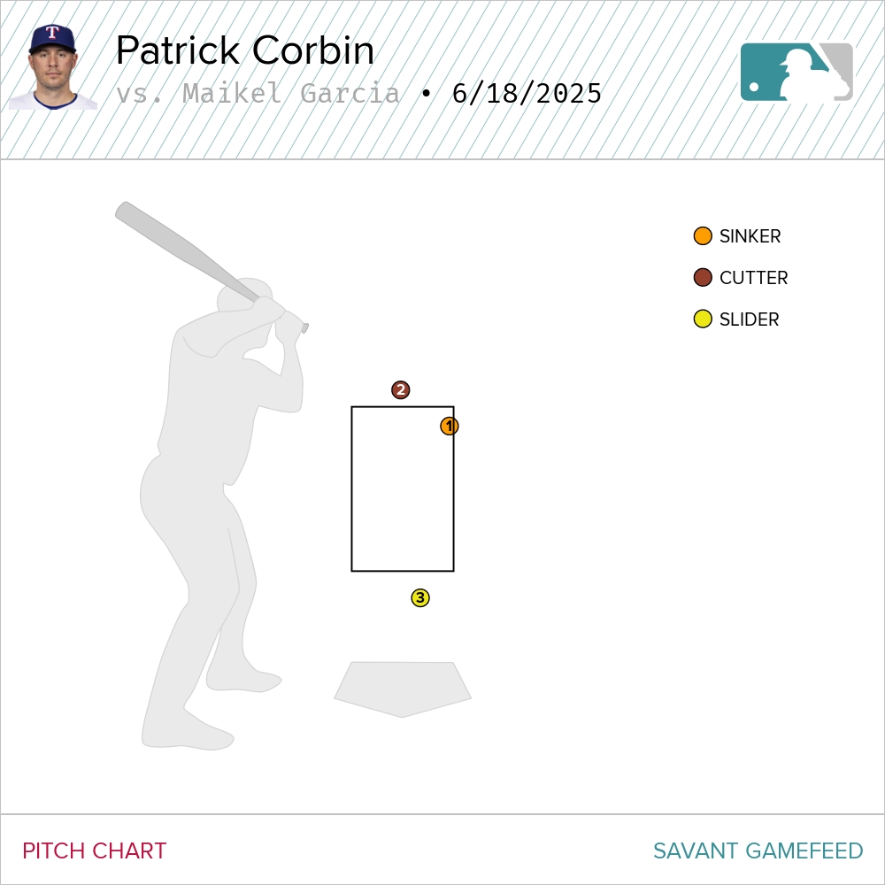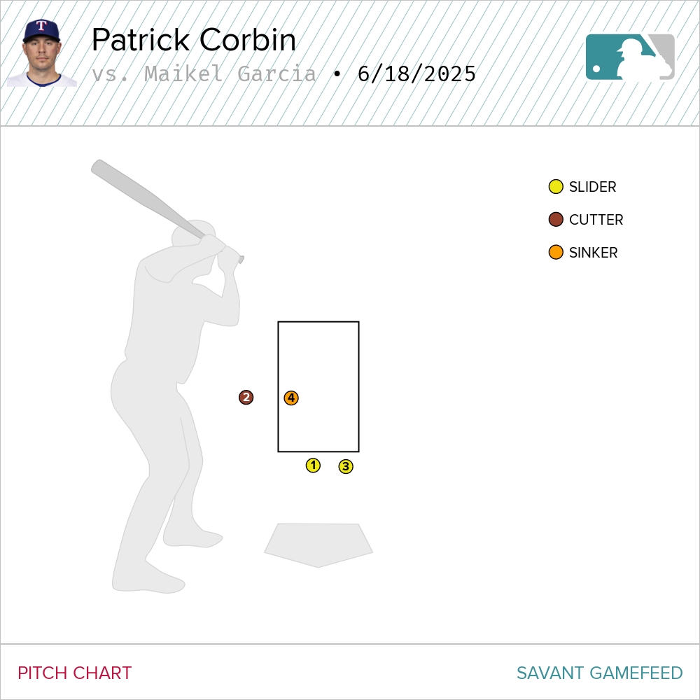 In their opening duel in the top of the first, Rangers starter Patrick Corbin threw three different pitches to Garcia: a sinker, a cutter and a slider. All three were on the inner half but at varying heights. Garcia lined out on a belt-high cutter.