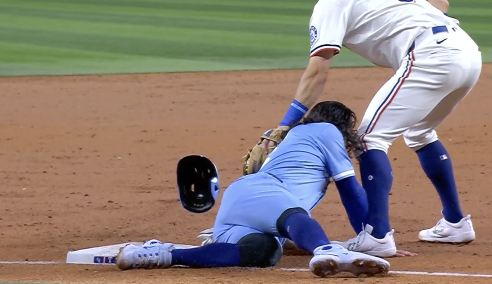Garcia was in a position to hit a three-run bomb thanks to a fortuitous replay decision from the crew in New York. Jonathan India, who drove home the first run of the inning on a single, advanced to third on a single from Bobby Witt Jr. It was a bit of aggressive baserunning from India, but he easily beat the throw. The question, as so often is raised in the replay era, was, did India slide off the bag while the tag was being applied? I think it was safe to assume that, yes, India did leave the bag momentarily, but every angle of replay we saw showed something like this: