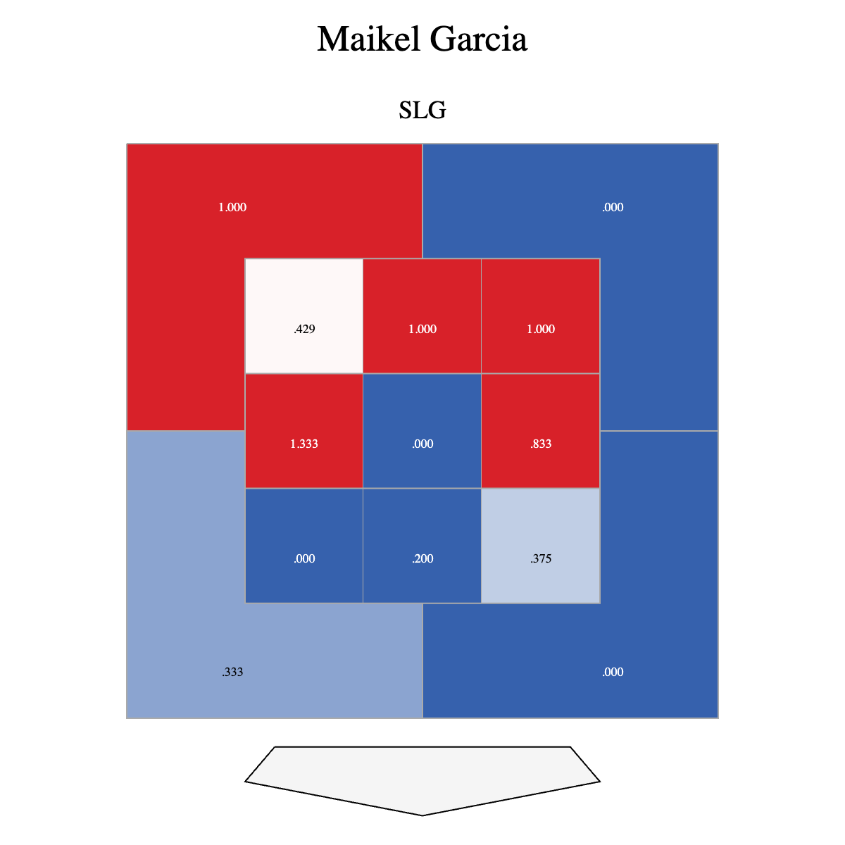 Keep in mind that when looking at a chart like the one above, there is very limited data. Entering Wednesday, Garcia was slugging 1.333 versus left-handed pitching on offerings on the inner half in the middle. That’s gone up.
