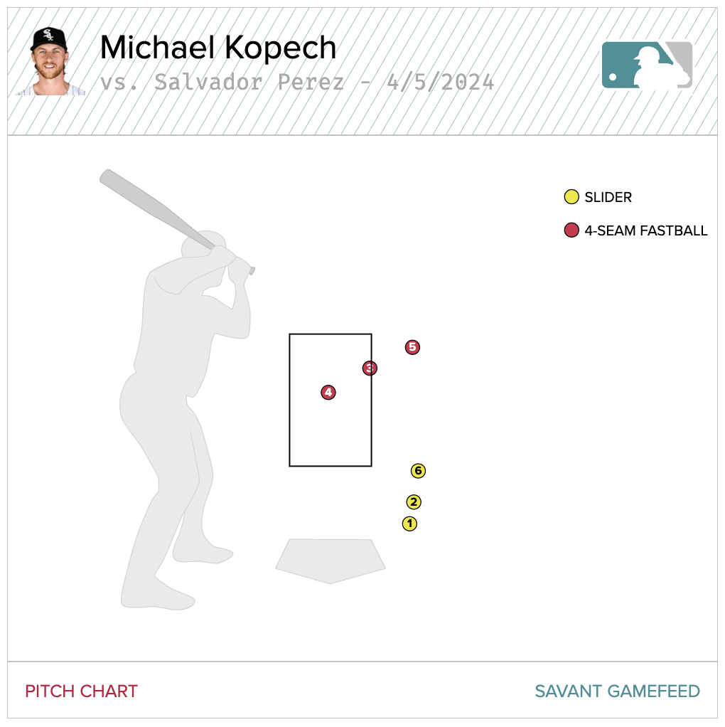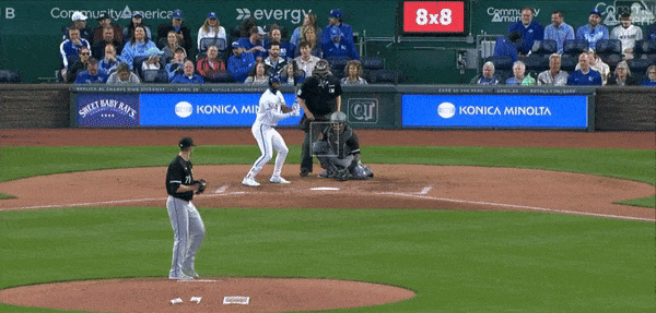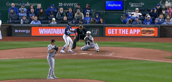 He had a helluva PA against White Sox starter Garrett Crochet, though. Crochet, Chicago’s Opening Day starter, has been worthy of that distinction, posting a 1.38 ERA in his two previous starts, striking out 16 and walking just one in 13 innings of work. Sunday he didn’t give up a hit until Nelson Velázquez led off the fifth with a single. Crochet, despite looking in command, was fighting the command of his four-seamer; he was leaning on his slider a bit more than usual in key situations. Renfroe and the Royals picked up on this and the right fielder was ready.