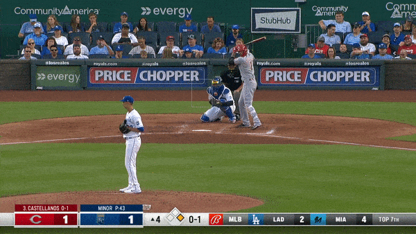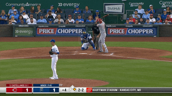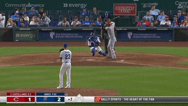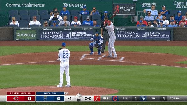 Again, go back and look at where Salvador Perez is set up. At first glance, he’s looking for the pitch down and on the inside corner. If Minor is going to miss, he needs to miss off the plate inside. That’s where he was working the first two plate appearances. Except this time, he delivered a meaty 88 mph fastball right in Castellanos’ happy zone.