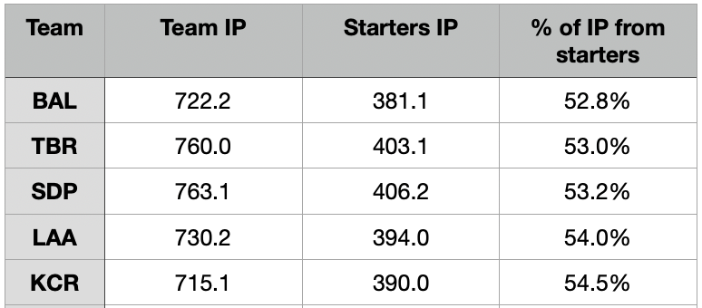 Still…progress on the starting pitching front, right? The Royals’ starting pitchers have thrown 396 of the 724.1 innings the club has played this year. That’s just 54.6 percent of the team’s innings eaten by the starting pitchers. Minor’s outing on Tuesday actually moved the needle 0.1 percent. Here are the bottom five teams in the majors through Monday who had received the fewest innings from their starters as a percentage of innings pitched.