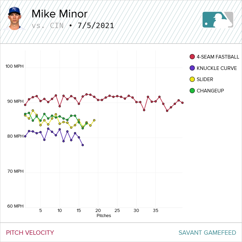 I’m not certain I dig Minor’s explanation of how he approached that at bat. Why would Minor “take a pitch off” in the seventh inning of a game against the best hitter in the opposing lineup? Especially immediately after his club took the lead? What on earth made him think he could sneak an elevated fastball by Castellanos? And calling the pitch a fastball is generous. Coming back to the mound following an extended break where the Royals sent six batters to the plate in the bottom of the sixth, it was Minor’s slowest fastball of the night.