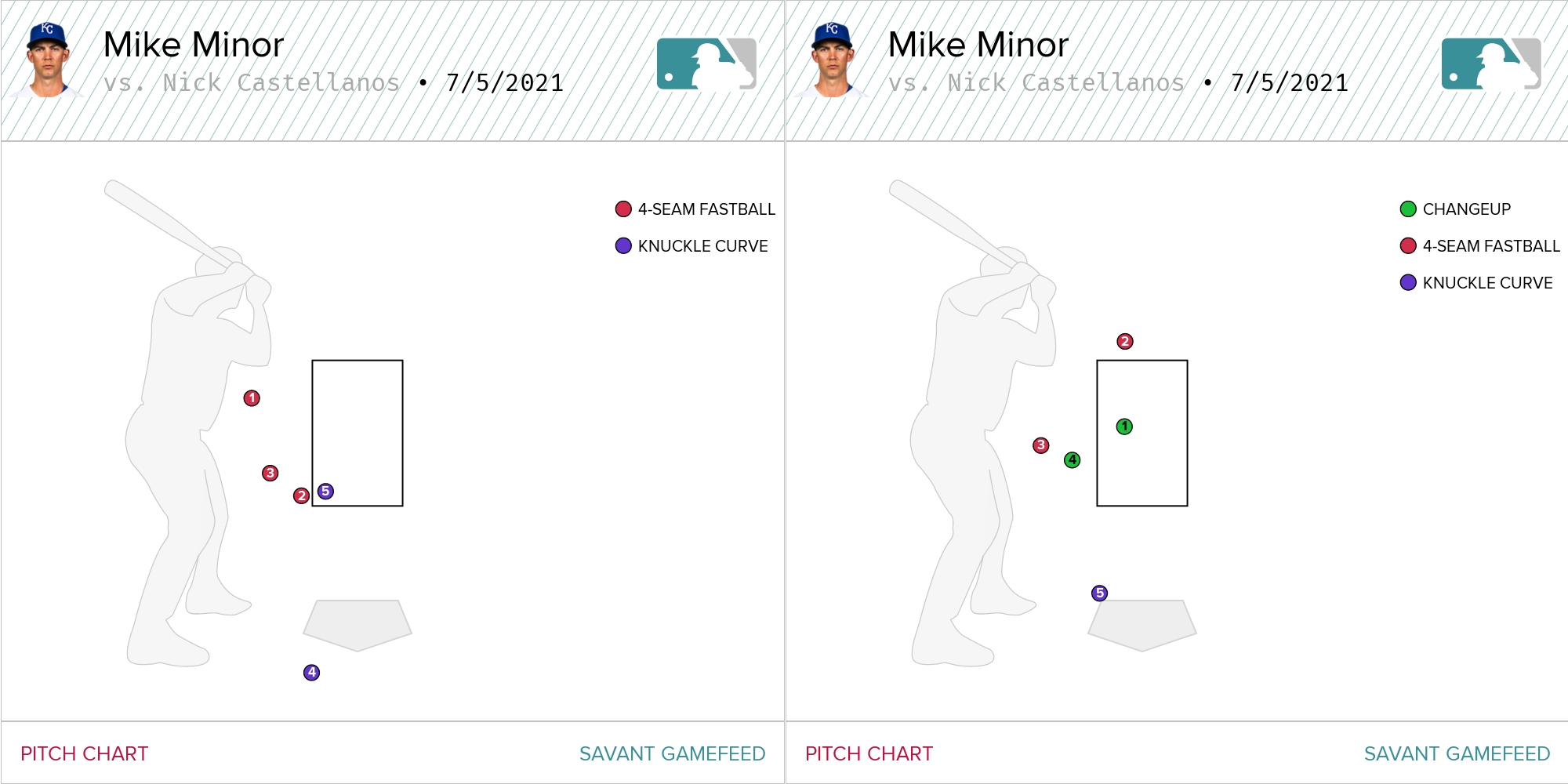 In the first two duels, Minor threw exactly two pitches in the zone. He worked Castellanos carefully. The pitch charts underscore this. The chart on the left is the strikeout in the first, the chart on the right is the strikeout in the fourth.