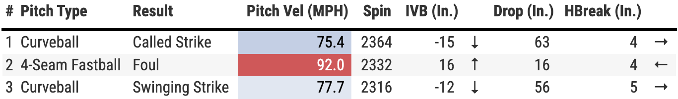Cameron fell behind 3-1 and went four-seam, four-seam, both pitches down in the zone. Both were fouled off. That sixth pitch of the at bat was Cameron’s 100th of the night. He reached back for a little something as it was his fastest pitch since one he uncorked in the third inning.