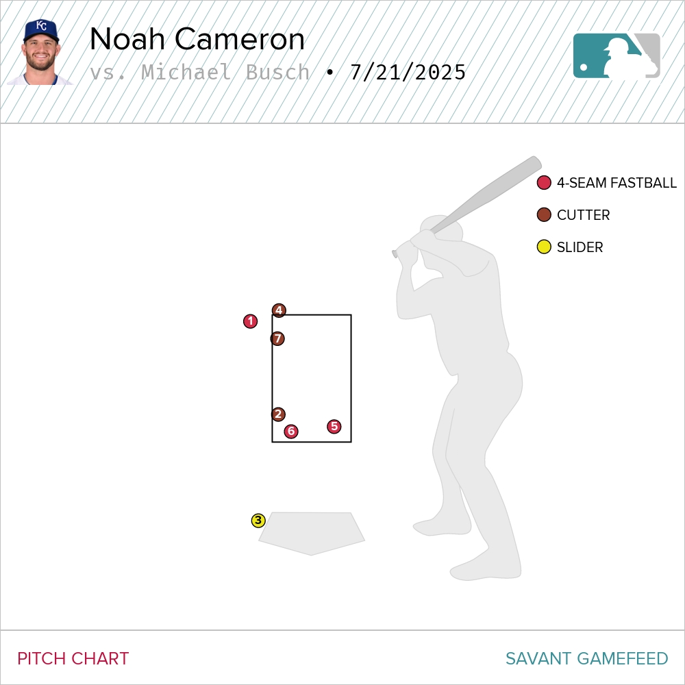 After the Royals jumped out to that early lead on the Caglianone home run, Cameron hit a bit of a speed bump in the bottom half of the inning. Carson Kelly went down and yanked a changeup out of the yard to tie the game up. With two outs and two on, Matt Shaw clobbered a similar pitch in a similar location to give the Cubs an early 4-1 lead.