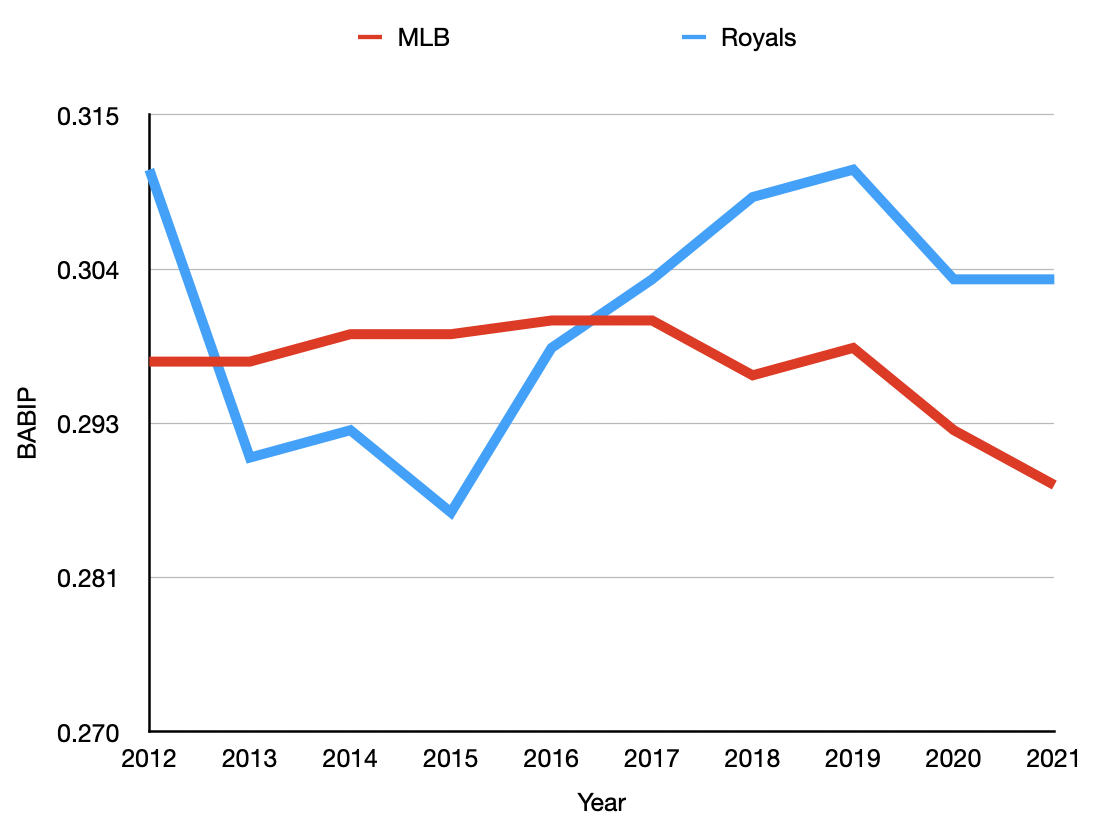 Kind of wild how this works. In the years where the Royals were better than league average on BABIP allowed by their pitchers, they were winning. The years where they were trailing, they weren’t. They also largely followed the league trendlines from 2018 to 2020. This year, even though BABIP is down overall, they’re holding steady with a .303 BABIP through their first 53 games.