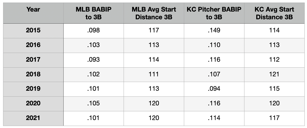 As in center, Royals’ third basemen have crept in a little bit in 2021, going slightly against the league averages. The impact of playing in at third is less than in center for obvious reasons. However, historically, balls third basemen in Kansas City have a higher BABIP than league average. The outlier season was in 2019 when Hunter Dozier played most of the innings at the hot corner. He’s played the most innings at third thus far in 2021, but with the time he’s missed, it certainly hasn’t been a majority. If Dozier can stay healthy and spends most of his time at the hot corner, it will be interesting to track BABIP on balls hit to third. Will it decline from where it stands currently?