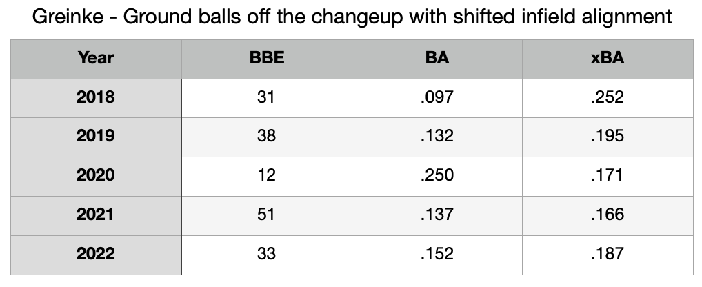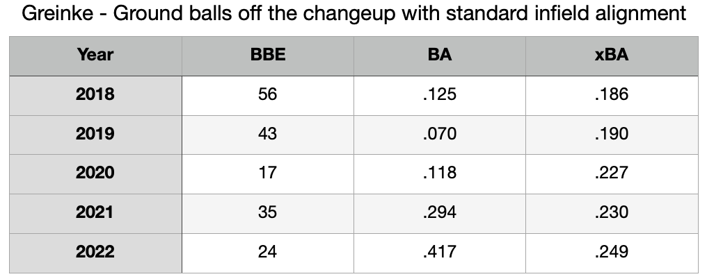 The following table is how Greinke fared when his changeups were hit on the ground with a shifted infield defense behind him over the last several years. The data is pulled from Baseball Savant.