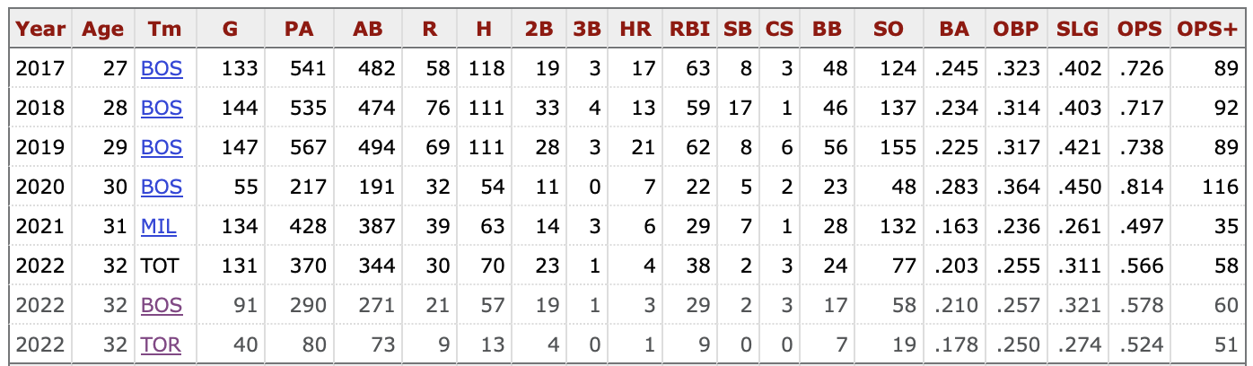 The 2020 season was a small sample blip. He’s really fallen offensively since the start of the 2021 season. The bat has undermined what continues to be stellar defense. Bradley was worth -1.6 fWAR in 2021 and -0.1 fWAR last year.