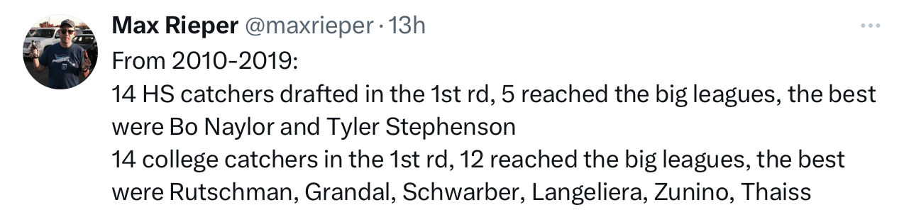 Now, to be fair, Baseball America rated Blake Mitchell as the number one prep catcher in the draft, and number 15 overall. That was kind of the universal pre-draft take: Mitchell was a first round talent. Just not a top 10 first round talent.