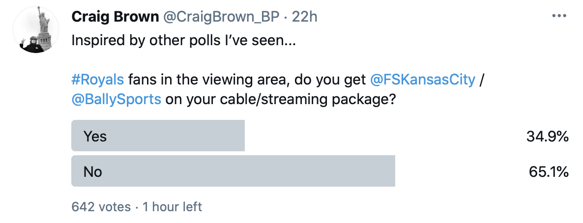On Wednesday, I published a Twitter poll. It hasn’t closed as of this writing, but the results are in. And hoooooo boy, is Bally Sports making a colossal mistake in limiting their product to Royals fans.