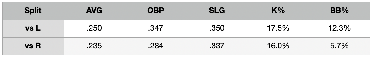 Thursday’s starter Brad Keller will be facing a Rangers lineup that tilts strongly to the left. According to the Roster Resource page at Fangraphs, six of the nine expected starters will dig in from the left side, including Three True Outcome monster Joey Gallo and freshly acquired Nate Lowe. As you would probably expect, in his career the right-hander Keller has had less success when up against the platoon advantage.