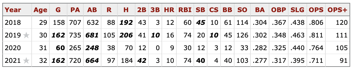 That’s declining production pretty much across the board, although I’m willing to overlook the Covid year of 2020. Merrifield has lost 50 points of on base percentage over the last three seasons while his slugging percentage has dipped over 65 points in the last two. Entering his age 33 season, it’s not difficult to look at these numbers and conclude Merrifield is in the midst of the decline phase of his career.