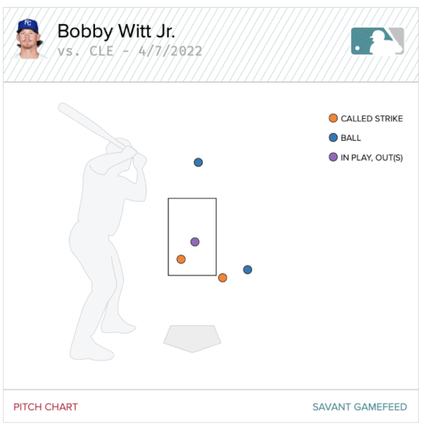 In that at bat, Witt watched the first two pitches for called strikes—the second one was off the dish. McKenzie couldn’t get him to bite on a slider down and away or an elevated fastball. The pitch Witt put into play was a center-cut fastball.