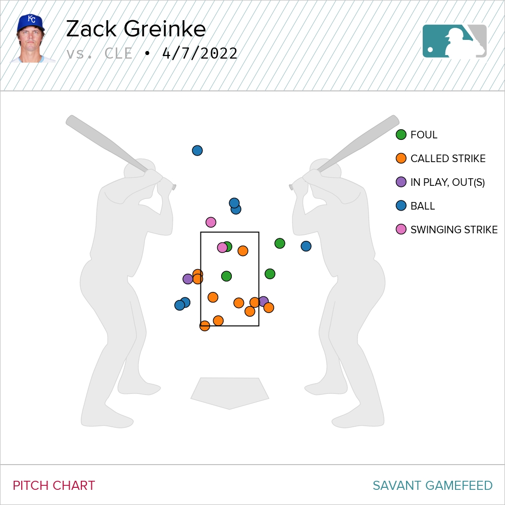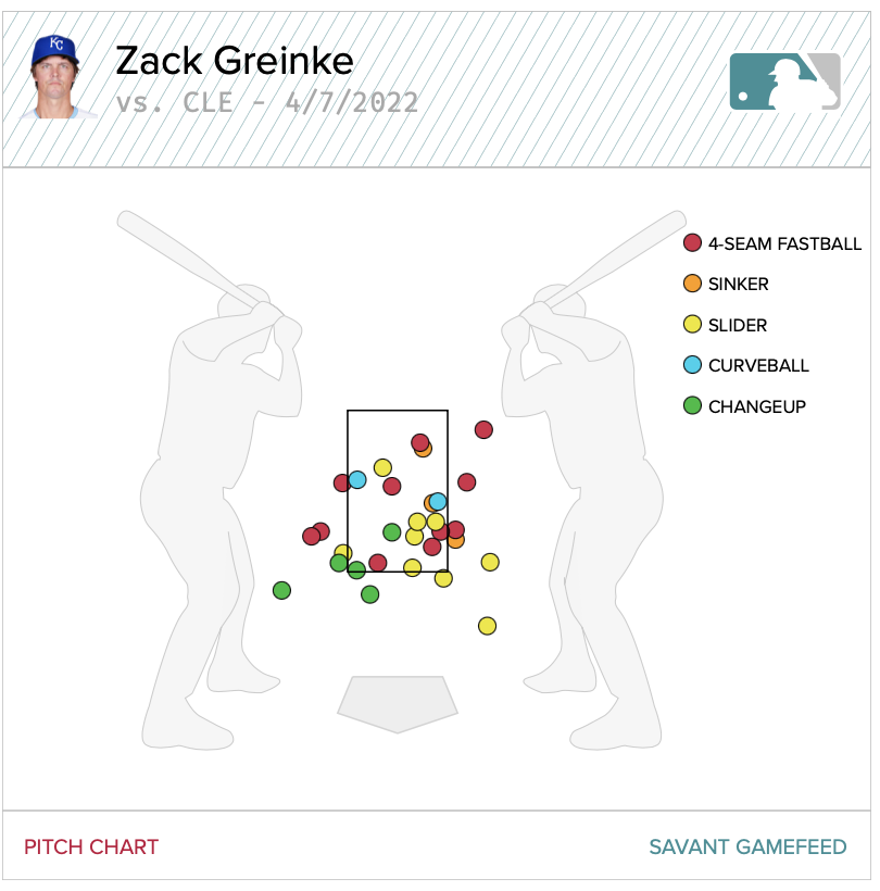 Greinke flummoxed the Guardians lineup the first time through. Facing the minimum, he allowed six grounders, two fly balls and one infield pop. It was vintage, late-career Greinke where he kept everyone off balance with a well-located array. He required 30 pitches to record those nine outs.