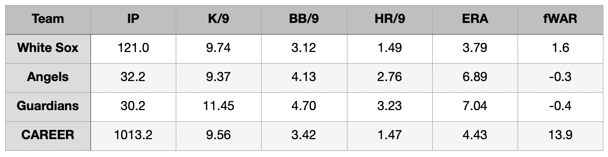 Giolito is a flyball pitcher who is prone to coughing up the long ball. You can see from the table above, that was a contributing factor to his nightmares in LA and Cleveland. If he were to make his home at The K, you would expect that issue to abate somewhat. He also struggled with his control as the season progressed, but is generally solid in the walk department, while posting quality whiff rates.