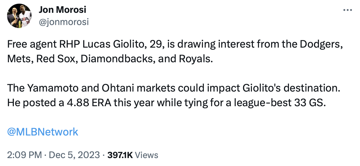 The Royals have been officially linked to a real, live, free agent. And some they’re in some heady—and difficult—company. It’s also a starting pitcher who I would be in favor of acquiring in Lucas Giolito. The right-hander was having a typically solid season for the White Sox last year but saw everything derail after a trade sent him to the Angels at the deadline. Los Angeles released him in late August in a move to get under the luxury tax once their playoff hopes were completely dashed. The Guardians picked him up and he continued to struggle in the final month of the season.
