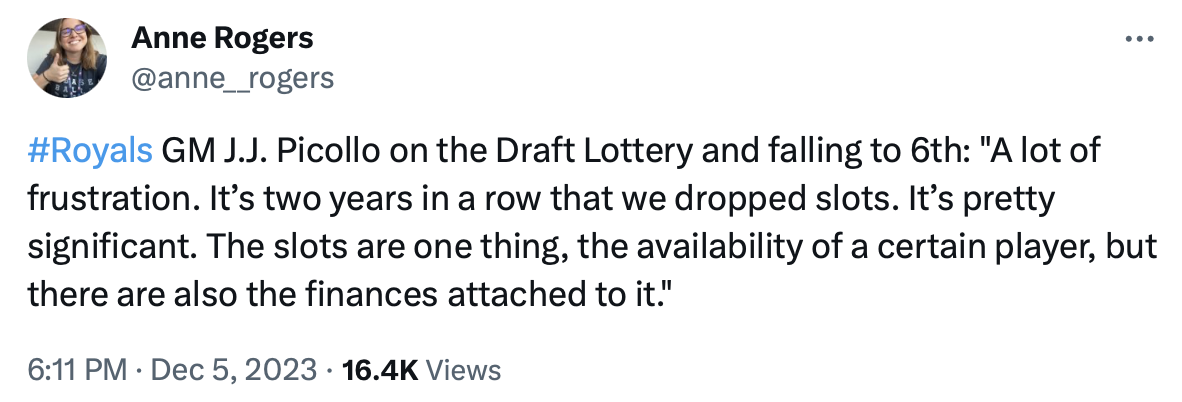 This is the second year in a row that the Royals lost position in the lottery. Last year, they had the fifth pick in their grasp, only to slide to eighth once the ping-pong balls were sorted.