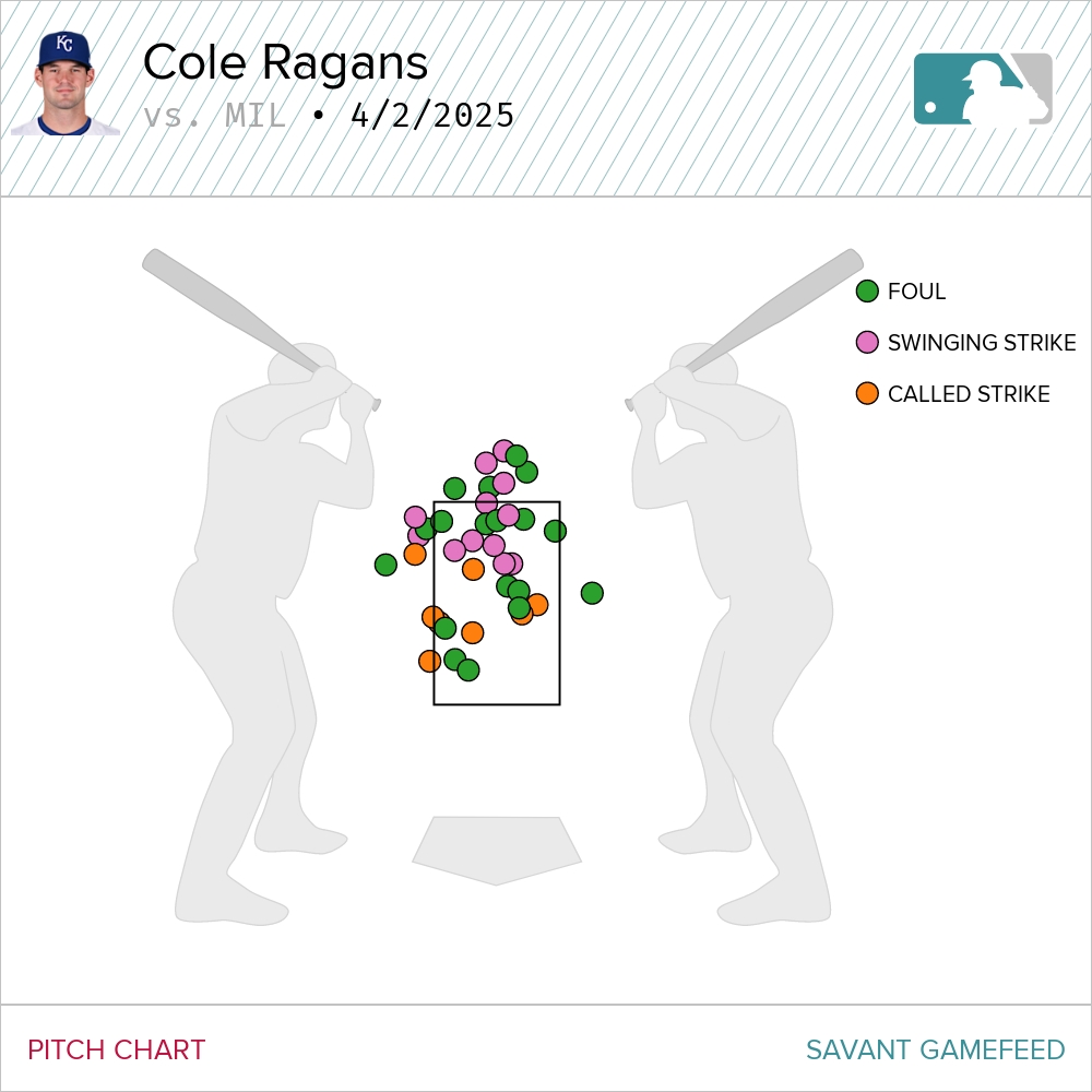 In that start, Ragans threw his four-seamer 58 percent of the time, and Brewers hitters, while swinging and missing 13 times on the pitch, also fouled it off 18 times.