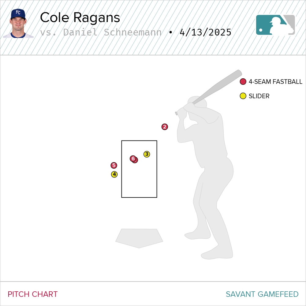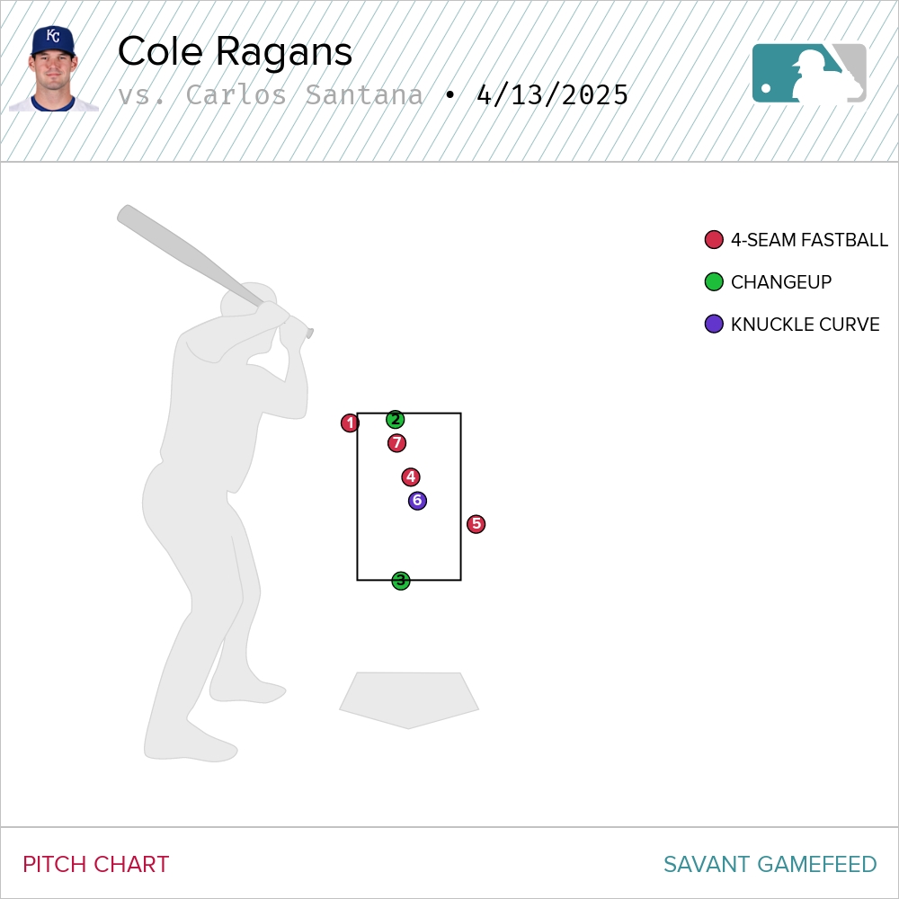 Any of the first three pitches could’ve been called a strike. After that, Ragans went to work pounding the zone before finishing Santana with some high cheese.