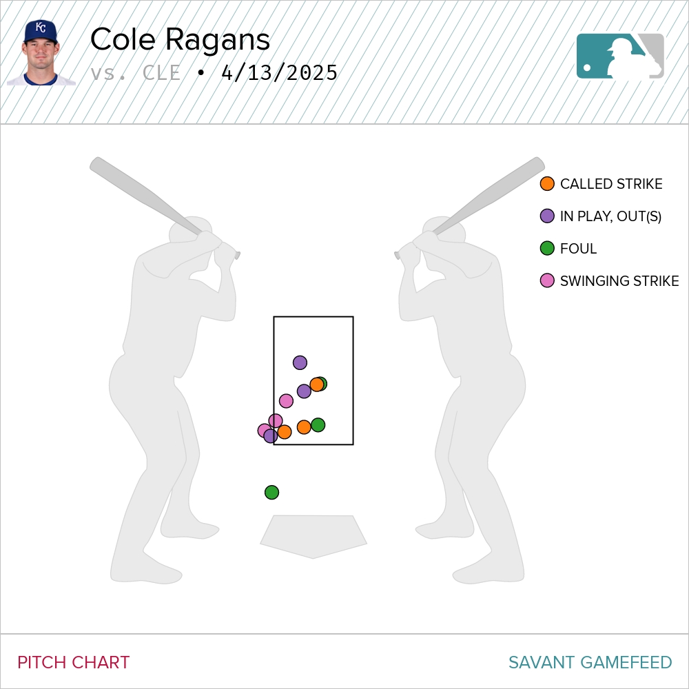 Ragans needed just six pitches to get three outs in the first. José Ramírez swung at the first pitch he saw and put it in play. Carlos Santana jumped ahead 2-0 before he ripped a center-cut fourseamer off the wall in left. He hit it so hard (111 mph) but MJ Melendez played the carom perfectly to pick up the easiest assist he’ll ever have as Santana was thrown out by miles at second.