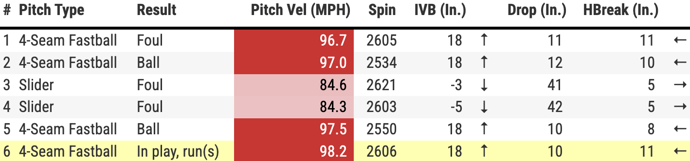 Besides those three fouls from Martínez, there wasn’t another foul in the inning as Ragans navigated the next three batters on 10 pitches. One of those hitters, Austin Hedges, pulled a tasty four-seamer into left for a single.