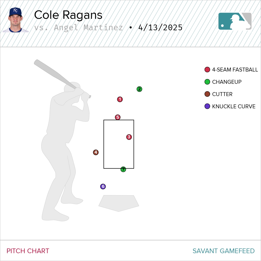 The fifth saw the inning begin with another extended battle. This time, it was against Angel Martínez. Like the battle an inning earlier against Santana, Ragans fell behind early. Unlike against Santana, Ragans was spraying his pitches.