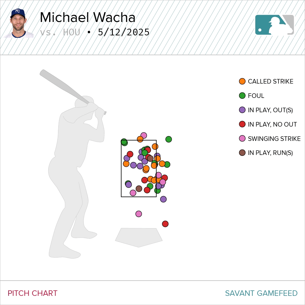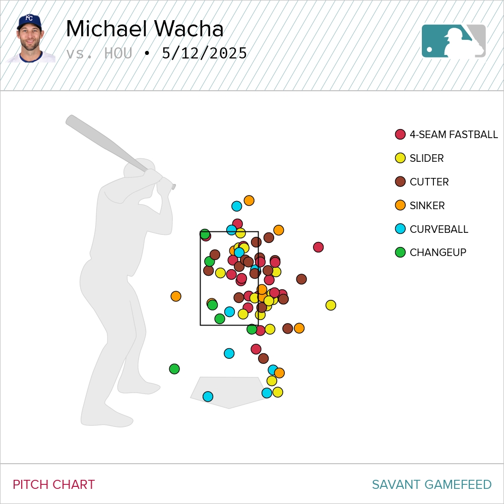 When I see a chart like this, I think the pitcher was on point with his command. Most everything is on the outer half of the plate against righties. The four-seamer and cutter are higher, as you would expect, and those are meant to get a swing, so they’re a little more centrally located. But if Wacha was missing, he was missing away, in a spot where the Astros couldn’t hurt him if they swung the bat.
