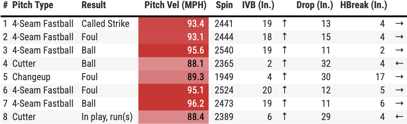 Indeed, Wacha didn’t get many whiffs on the night. Only six on 40 total swings, a lowly 15 percent. That’s not normally his game, but he was down by about five percent on his seasonal average.