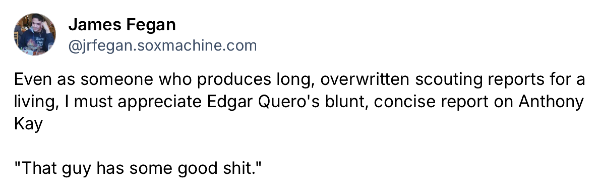 Kay had random cups of coffee from 2019 to 2023, first with the Toronto Blue Jays and then with the Cubs and briefly with the Mets. For his career, he had a reverse platoon split with left-handed hitters generally doing better against him. Lefties hit .270/.362/.549 against Kay in his major league career.