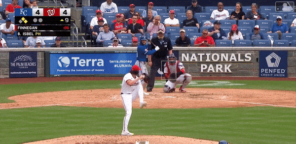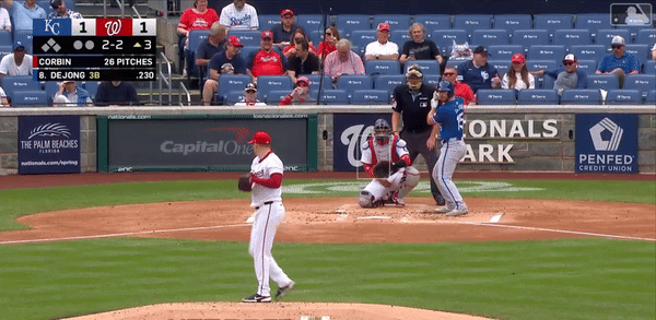 They opened the third against Nats starter Patrick Corbin with a seven-pitch walk from Paul DeJong. DeJong is an unlikely catalyst at this point, having cooled off in the extreme since his start to his Royals career. Prior to that walk, he had reached base just six times in the month. That translates to a .152 on base percentage. After starting the count 1-1, Corbin broke off three consecutive sliders. With the count at 2-2, look at the location and the result of the fifth pitch in the plate appearance.