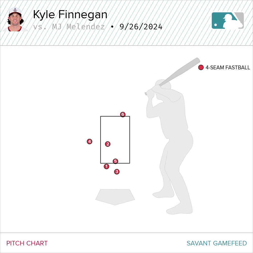 The sixth and final pitch was really close. Too close, almost. Except this was an incredibly disciplined plate appearance from Melendez. With the game tied at four, he knew he needed to reach base. Finnegan was pumping heat. With a handful of pitches low, and with that fifth pitch a swing and a miss, Melendez could be looking for something up. In that location of the sixth pitch, Melendez has a 48 percent whiff rate. So if he offered at that pitch, it was a coin flip if he could make contact. Further, even if he was able to make contact, Melendez is hitting just .133 on elevated (or similarly located) four-seamers this year. A swing on that pitch isn’t a great outcome for Melendez. He took a chance by watching and it worked out.
