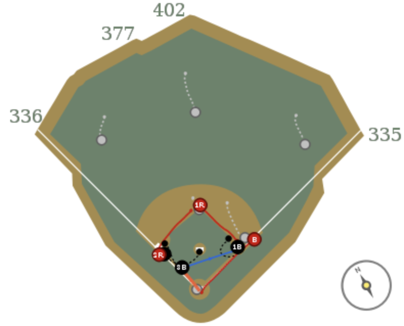 The diagram below shows the starting position of the fielders with the small dots. It’s a little difficult to see because of the action along the third base line, but Tena was very close to the bag.