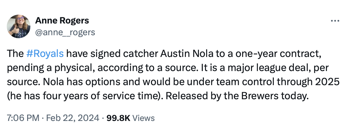 On the surface, the signing of Nola doesn’t seem to make much sense. The Royals already have a starter in Salvador Perez and a more than capable backup in Freddy Fermin. Why add another catcher to the 40-man roster?