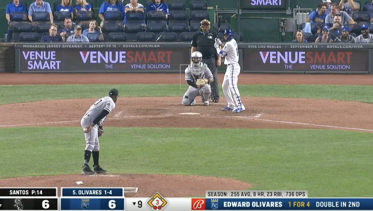 For example, in the above photo, we learn the game is tied in the ninth inning at six runs apiece. The bases are loaded. There are two outs. Edward Olivares is facing Gregory Santos.