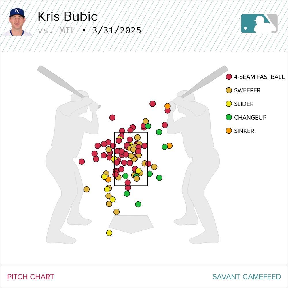 What intrigued me the most while watching the game was how the four-seamer played off the sweeper/slider combination Bubic was showing. Or maybe it was the other way around with the sweepers and sliders playing off the four-seam.