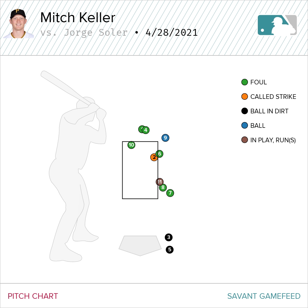 Finally…FINALLY! On Wednesday Soler’s luck began to even out. He set the stage for the night with an epic 11-pitch at bat against Pirate starter Mitch Keller.