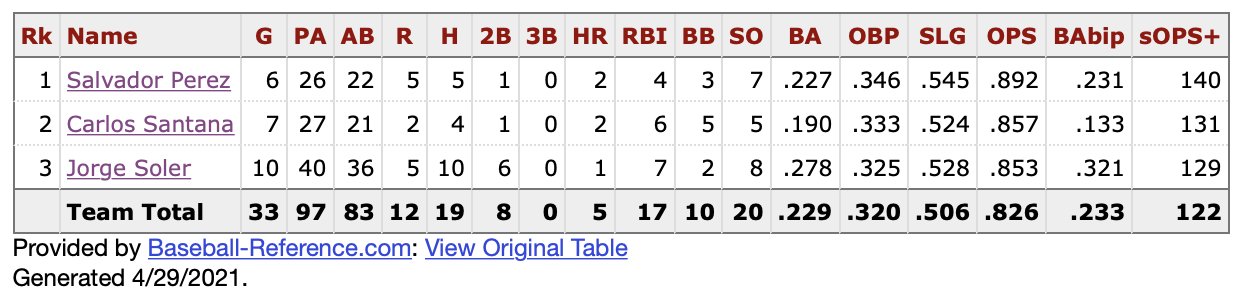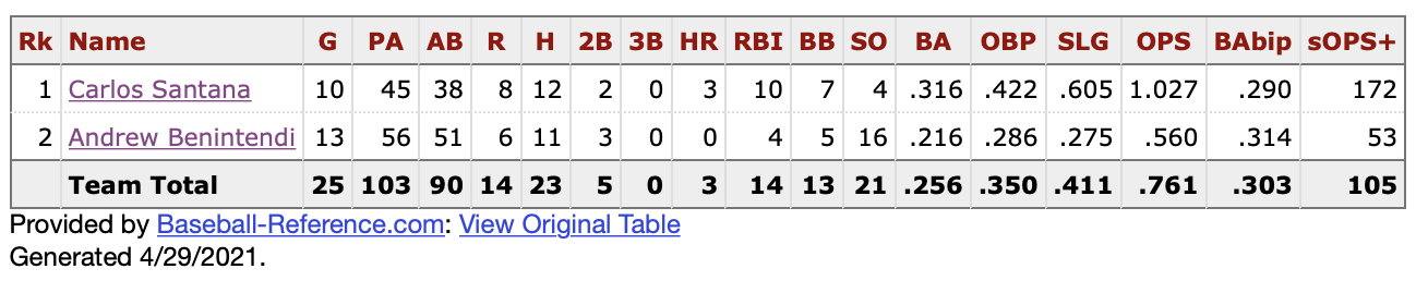 This is a tale of two hitters. Andrew Benintendi occupied this spot for each of the first 13 games for the Royals and simply didn’t perform. Carlos Santana has hit there for the last 10 and is currently swinging the hottest bat in the lineup. Combine the two and yep…very close to averagish.