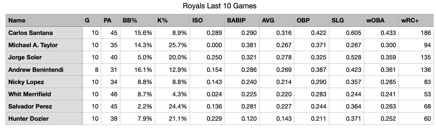 Obviously, timing matters. It’s a good thing for the Royals that Santana has responded so favorably to his move up the order. That’s given the club a much more balanced top half of the lineup over the last 10 games.