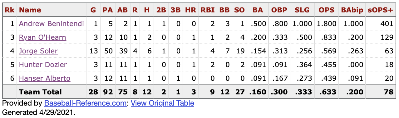 But before Soler was the cleanup man, he was hitting fifth. And things weren’t going so great. Since Matheny moved him up to hit fourth, he’s used an array of players in the fifth spot. Hanser Alberto had three games there when the Royals were facing a cavalcade of southpaws. Since then, it’s been Hunter Dozier and Ryan O’Hearn. No one has distinguished themselves in this position. It’s reflected in the overall numbers.