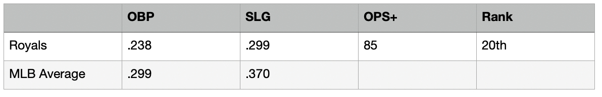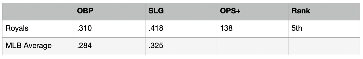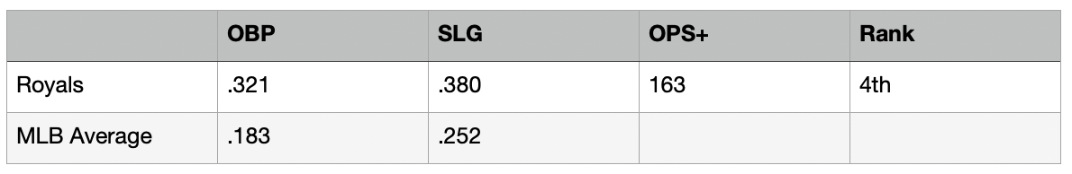 A month into the season and it feels like we have yet to see the true Royals’ offense. If the fifth and sixth spots in the order can fire up, along with continuing above-average production from the cleanup and bottom of the lineup, they should continue to outpace the league average in runs per game.