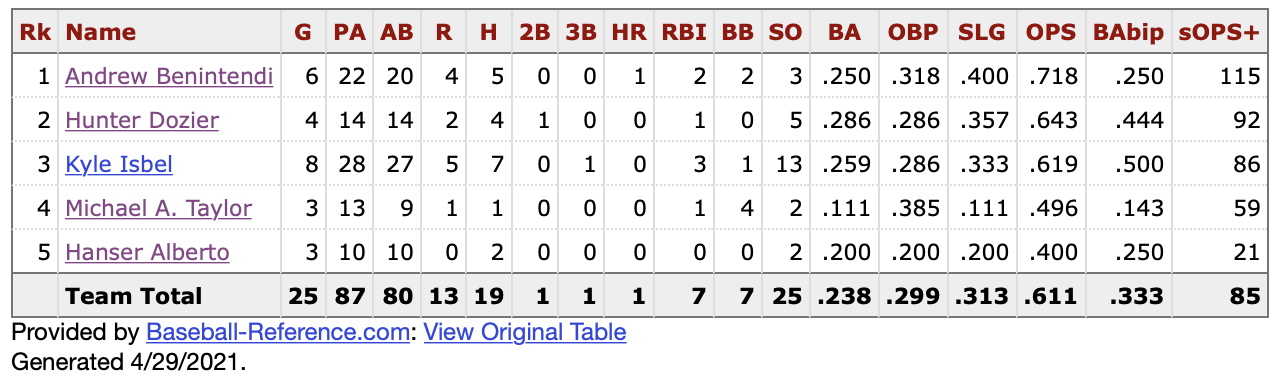 Naturally, while there are plenty of positives and reasons for optimism, some warning signs have sprung up in various places. The main takeaway is that it’s still early. This is where the Royals are at this point. Adjustments will be made. Players will rotate. Production will change.