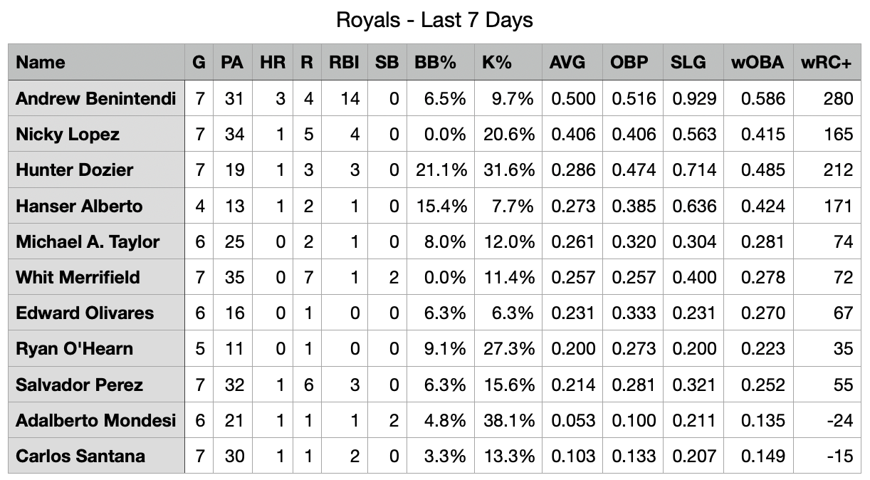 With Benintendi absolutely scorching on this road trip, I thought it would be fun to break it out for all Royals hitters. Who’s hot? Who’s not?