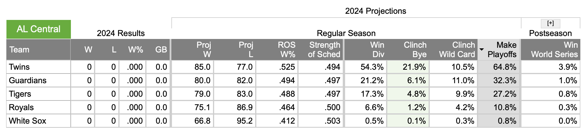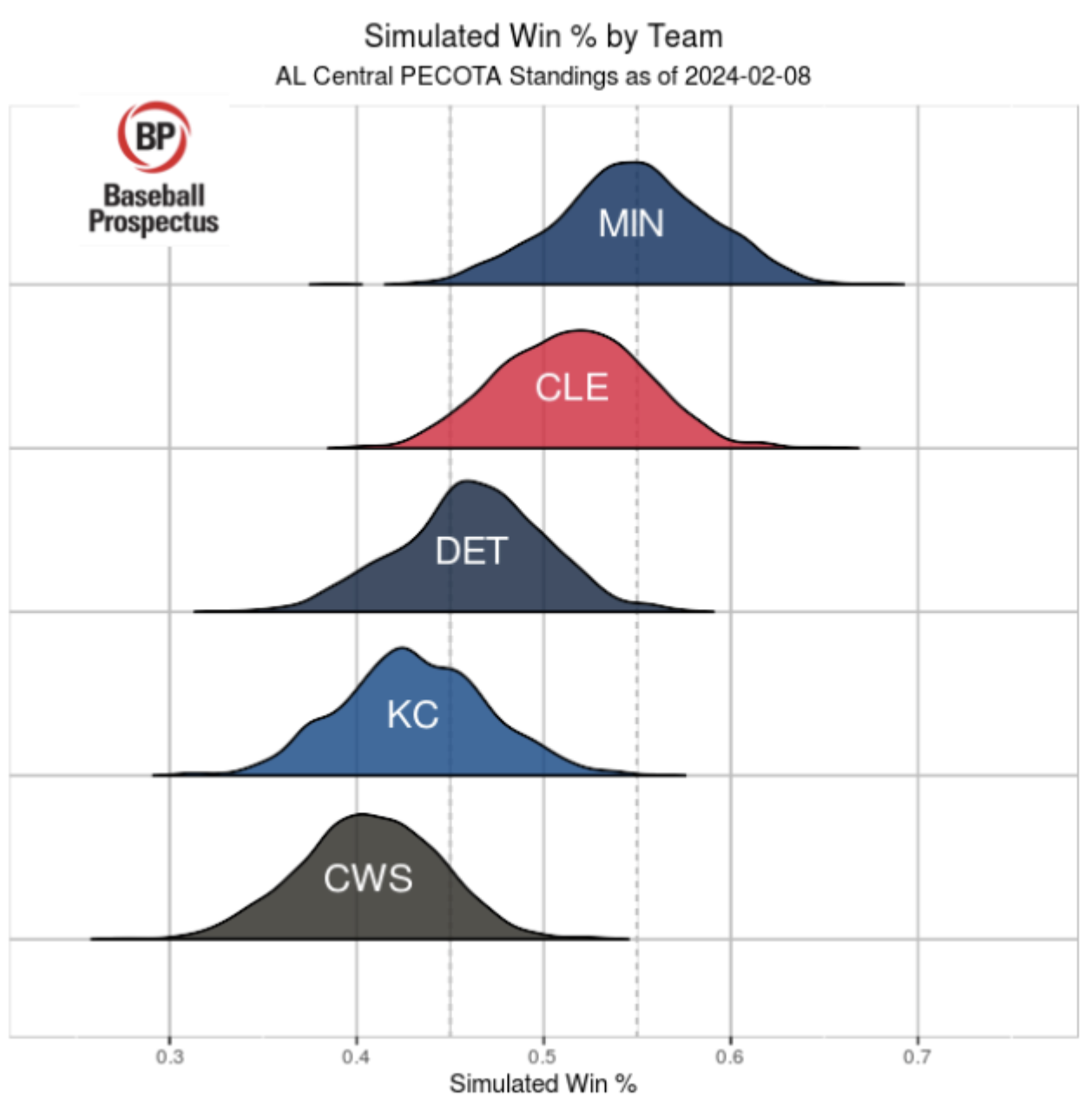 What I’m reading here is that the circuitry behind PECOTA thinks the Twins and Guardians are still the best in the division, even though most teams have spent the winter doing basically nothing to improve their teams. Although the gap has closed between the Royals and Tigers and those two teams.