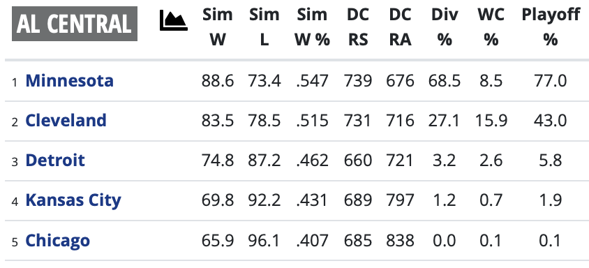 FanGraphs, which uses a mixture of ZiPS and Steamer for their projection, is more bullish on the Royals but still sees a similar outcome in the division.