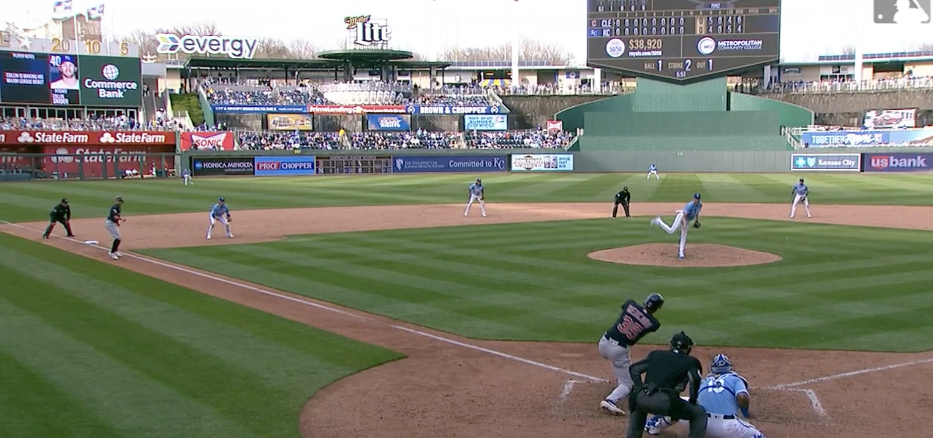The batter is Oscar Mercado. Mercado finished 2021 with a sprint speed of 28.9 feet/second. Broken out by several decimals, that would make him the 51st fastest runner in baseball last year. I would think that with the positioning of Witt almost level with the bag, the play on a sharp ground ball would be to attempt to turn two, despite Mercado’s superior sprint speed. Witt would also have the option of having the play in front of him, so he could, if Miller went on contact, go home. If the ball is hit to him, Witt will have to make a split-second decision to either try to start the double play or go home.